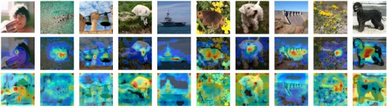 该研究对 CAE 以及 MoCo v3 的注意力图做了可视化。如下图所示,第一行是原图,第二行是 MoCo v3,第三行是 CAE。红色表示注意力值更高,蓝色表示注意力值低。处于蓝色边界内部的区域,通过这样的原则筛选:将注意力值从大到小排序后,保留累计和达到所有位置注意力值总和的 50% 的部分。可以看到,MoCo v3 的注意力图主要在图像的主体区域有高响应,而 CAE 能考虑到几乎所有 patch。