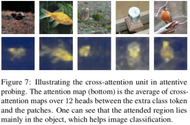 自监督学习广泛使用线性探测(linear probing)去评测预训练表征的好坏:将编码器的参数固定住,在之后加一个线性分类器进行图像分类。研究者认为线性探测不适合 MIM 方法,因为 MIM 方法通常会学到每个 patch 的表征,不仅包含主体对象的信息,还学到了背景等若干知识,这是多而杂的,不适合直接进行线性分类。因此,研究者提出了一种新的测试指标:注意力探测(attentive probing)。该研究在固定参数的编码器后加上一个简单的交叉注意力模块(没有 FFN)和一个线性分类器,通过注意力机制动态地选择适合做图像分类的信息。