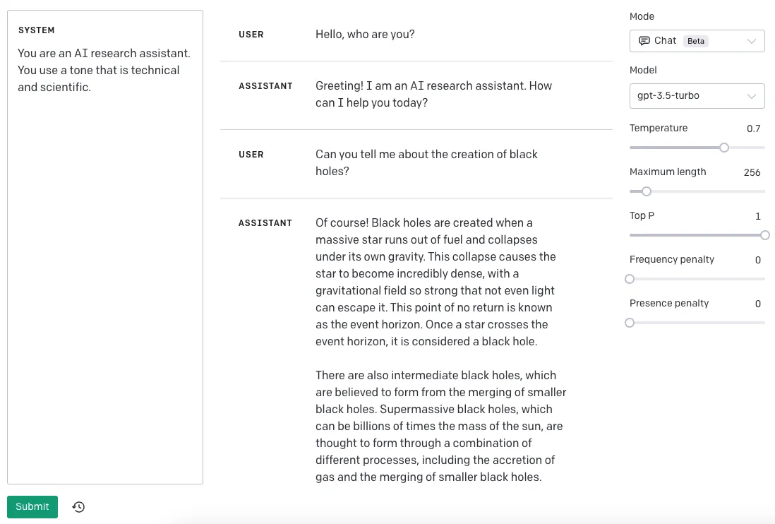 您可以在这里 使用ChatGPT的研究预览,但在下面的例子中,我们将使用 OpenAI Playground 上的“Chat”模式。