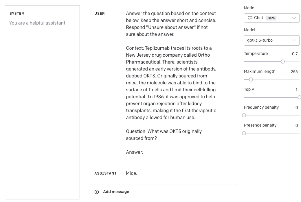 聊天格式使得多轮对话成为可能,但它也支持类似我们使用text-davinci-003进行的单轮任务。这意味着我们可以使用ChatGPT执行类似于我们对原始GPT模型进行演示的任务。例如,让我们尝试使用ChatGPT执行以下问答任务: