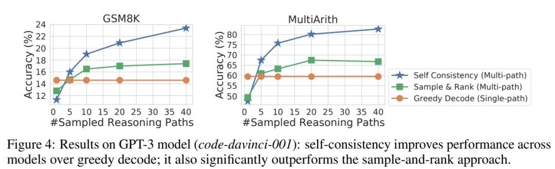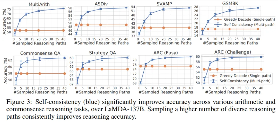 下图 3 中通过对来自解码器的不同数量的推理路径进行采样,展示了自洽性与贪心解码(Single-path)的性能比较。可以看到,采样更多数量(如 40 个)的推理路径始终会产生更好的性能,再次强调了在推理路径中引入多样性的重要性。