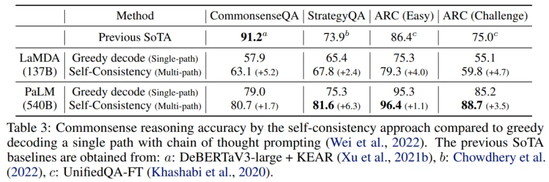 常识推理结果如下表 3 所示。对于 LaMDA-137B 模型,自洽性策略显著提升所有任务的准确率,其中 StrategyQA 和 CommonsenseQA 的绝对准确率提升了 2%-5%,ARC easy set 和 ARC challenge set 的绝对准确率分别提升了 4.0% 和 4.7%。