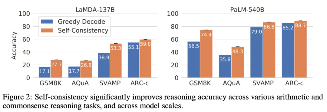 对于更大的 PaLM540B 模型,自洽性策略显著提升性能,在 ASDiv、AQuA、SVAMP 和 GSM8K 上实现了 7.9%、12.5%、7.6% 和 17.9% 的显著增益。