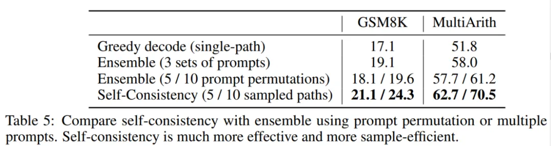 该研究将自洽方法和基于集成的方法进行小样本学习来比较二者的性能。结果如下表 5 所示,与自洽方法相比,基于集成的方法获得的增益要小得多。