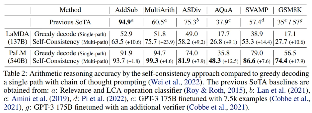 算术推理结果如下表 2 所示。对于 LaMDA-137B,自洽性策略在每个任务上较贪心解码(Single-path)均实现了显著的性能提升,在 AddSub、ASDiv、AQuA 和 GSM8K 任务上获得接近 10% 绝对准确率提升,在 MultiArith 和 SVAMP 任务上分别提升了 23.9% 和 14.4%。