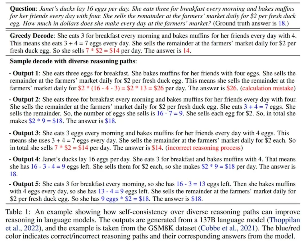 如下表 1 所示,一个模型可以为一个数学问题生成多个可能的回答,这些回答最终得出相同的正确答案(如输出 2、4 和 5)。由于语言模型不是完美的推理器,模型也可能产生错误的推理路径或者在某一个推理步骤中出错(例如输出 1 和 3 中),这种解决方案不太可能得出相同的答案( 表 1 中的 26 和 14)。