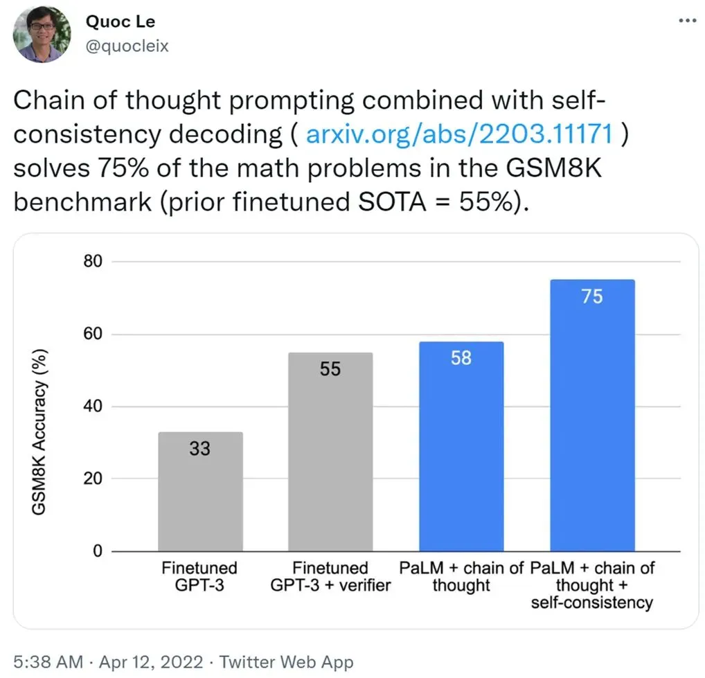 该论文的作者之一、Google Brain 的创始成员 Quoc Le 今天在推特上发文表示:这种自洽方法能够解决 GSM8K 基准中 75% 的数学问题,大幅超越现有方法。