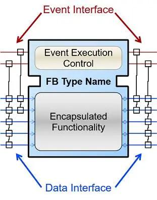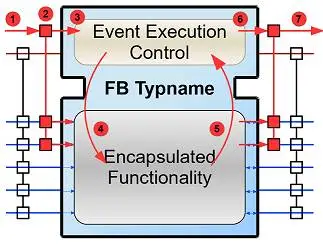 下图显示了FB的新外观。它封装了所需的功能。再次,输入在左边,右侧的输出,但现在界面被划分成事件和数据。事件在FB的顶部,红色,下部的数据为蓝色。事件触发FB的功能,数据输入是这些功能使用的数据。当事件到达时,在FB中发生的确切顺序显示在下一个图像中。事件和数据连接不兼容,这意味着您无法以任何方式将它们连接在一起。您可以扇入(多个输出到相同的输入)并扇出(与多个输入相同的输出)事件连接,您可以扇出数据连接。你不能做的是数据连接的风扇,因为FB不会知道要输入哪些数据。