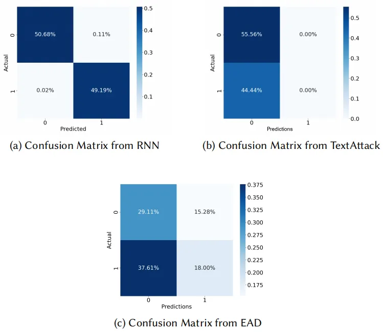 两种算法在平均扰动百分比方面存在巨大差异。EADs 高扰动率的原因是因为它作为优化的一部分始终将数据包特征全部扰动为 0,从而导致 200% 的距离。TextAttack 创建了一个更正常的距离,因为每个单独的数据包特征单独受到单个字符插入或删除的轻微干扰。借助 TextAttack,AE 能够成功地在攻击方面欺骗分类器,同时还允许良性数据包流保持良性。EAD 混淆矩阵也显示出类似的结果,但方差略大。两次攻击都有很高的误报率,这是攻击的目标。它们也有很高的真阳性率,这表明它们可以保留良性数据包而不会将它们转化为可分类的攻击。被归类为良性的攻击的百分比用于计算攻击成功率。结果表明,这两种算法都能够产生能够欺骗 DNS 放大分类器的高质量 AE。