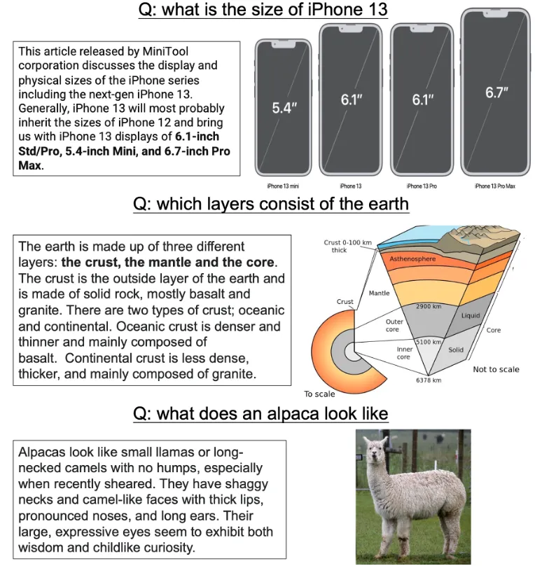 问答系统(Question Answering) 是人工智能和智能语言处理中非常重要的任务之一。近年来,随着大规模数据集(如 SQuAD、NaturalQuestions)的发布以及大规模预训练语言模型(如 BERT、GPT)的提出,问答任务得到了飞速的发展。然而,当前大部分问答任务都是单模态的,即问题、资源以及答案都是基于文本的。然而,从认知智能以及实际应用的角度来说,多模态资源如图像在很多时候往往能提供更为丰富的信息和答案。例如,对于一个问题:iPhone13 的尺寸是多少?一个针对 iPhone13 不同型号的尺寸对比图会更加清楚和直观。还有一些例子如下图所示:
