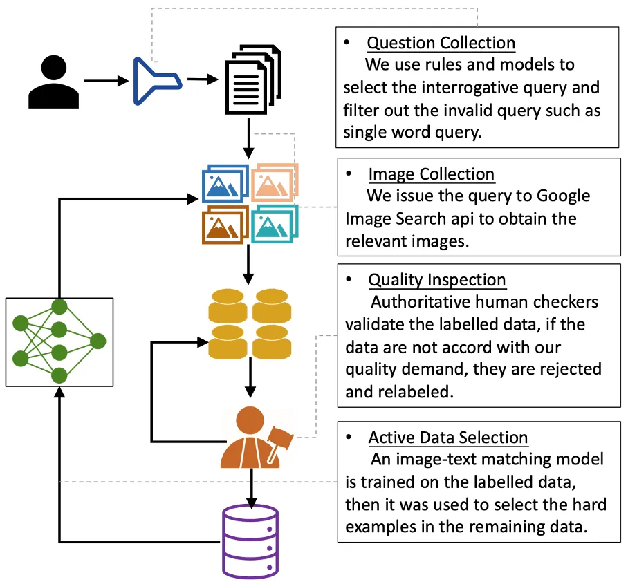 - 无偏的:因为随机 query 中也会存在 28 定律,即一些高频或者单一的问题往往会出现很多次,数据中这种简单模式的问题会占据大多数,造成数据中真正跨模态理解的偏置。因此,我们在数据收集过程中引入了两阶段的主动学习过程,在第一阶段随机 query 标注完成后,我们训练了一个简单的模型,然后用这个模型挑选出 "更难" 的一些模型,从而让二阶段的标注数据中数据的丰富度和难度相对更高。