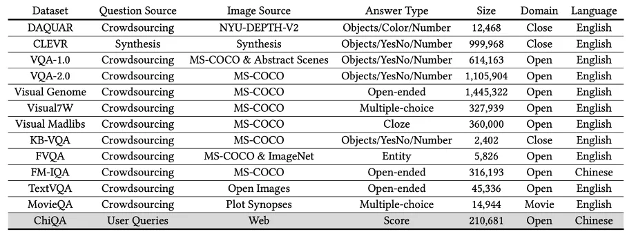 图二:ChiQA 和业界其他一些图像问答数据的对比