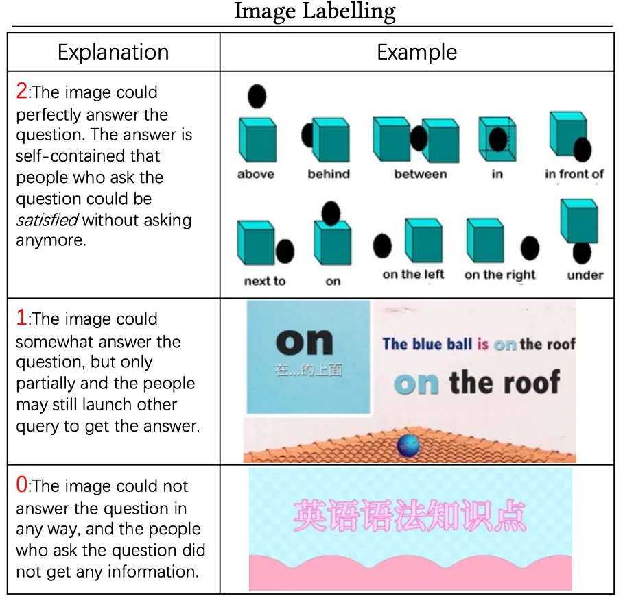 0 分表示这个图片完全不能用来回答这个问题,2 分表示这个图片质量过关并且可以完全独立的回答这个问题。而 1 分的图片则介于这两者之间,表示这个图片和这个 query 相关,但是却无法直接回答,用户可能需要更多的查询或者推理才能得到最终的答案。一些 0 分、1 分、2 分的例子如下图所示: