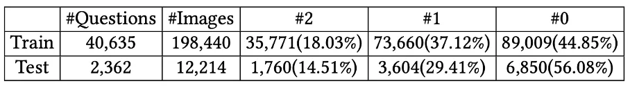 1)所有的问题都是图像相关的(image-dependent),即标注者看到图片之后提出问题。在大规模数据构建过程中,人工生成的问题往往会缺乏多样性,而且往往由于标注者的主观因素会产生偏置。在这种先看资源,再提问的数据上训练的模型往往可以不用看背景资源只看问题而轻易达到非常好的效果;