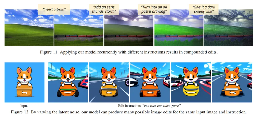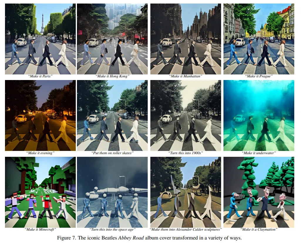 尽管 InstructPix2Pix 完全是在合成示例(即 GPT-3 生成的文本描述和 Stable Diffusion 生成的图像)上进行训练的,但该模型实现了对任意真实图像和人类编写文本的零样本泛化。该模型支持直观的图像编辑,包括替换对象、更改图像风格等等。