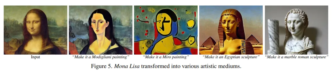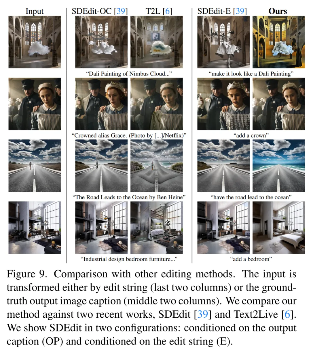 在下面这些图中,作者展示了他们新模型的图像编辑结果。这些结果针对一组不同的真实照片和艺术品。新模型成功地执行了许多具有挑战性的编辑,包括替换对象、改变季节和天气、替换背景、修改材料属性、转换艺术媒介等等。