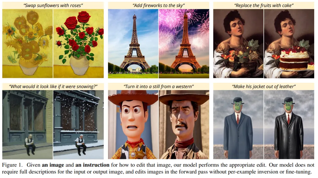 InstructPix2Pix 是一个条件扩散模型,给定一个输入图像和一个编辑图像的文本指令,它就能生成编辑后的图像。该模型直接在前向传播(forward pass)中执行图像编辑,不需要任何额外的示例图像、输入 / 输出图像的完整描述或每个示例的微调,因此该模型仅需几秒就能快速编辑图像。