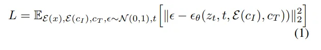 对于一个图像 x,扩散过程向编码的 latent 中添加噪声,它产生一个有噪声的 latent z_t,其中噪声水平随时间步 t∈T 而增加。研究者学习一个网络,它在给定图像调节 C_I 和文本指令调节 C_T 的情况下,预测添加到带噪 latent z_t 中的噪声。研究者将以下 latent 扩散目标最小化: