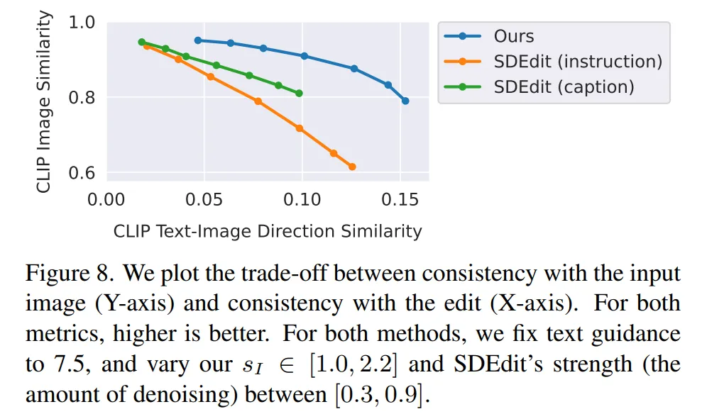 研究人员将新方法与最近的一些技术,如 SDEdit、Text2Live 等进行了比较。新模型遵循编辑图像的说明,而其他方法(包括基准方法)需要对图像或编辑层进行描述。因此在比较时,作者对后者提供「编辑后」的文本标注代替编辑说明。作者还把新方法和 SDEdit 进行定量比较,使用两个衡量图像一致性和编辑质量的指标。最后,作者展示了生成训练数据的大小和质量如何影响模型性能的消融结果。