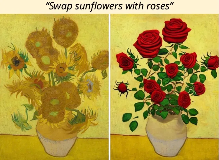 例如,要把画中的向日葵换成玫瑰,你只需要直接对模型说「把向日葵换成玫瑰」:
