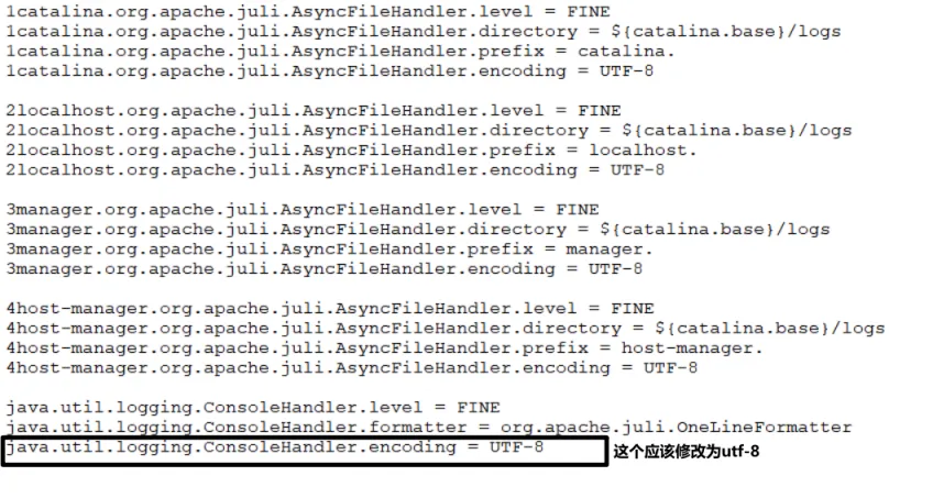 4.tomcat编辑文件语法设置为utf-8,否则会报乱码问题:修改logging.properties编码格式