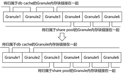 如图7.2-1所示,db cache和share pool都是由granule内存块构成的。图中上半部分和下半部分相比,AMM将granule3从db cache缓冲区调节给share pool共享池。可见每个缓冲区或者共享池等内存使用者都是一个由granule组成的链表,调节内存实际上就是将一个或多个granule内存块从一个链表移到另一个链表中。系统启动时会创建并维护一个granule Entry的数组,数组成员中的关键元素如下: