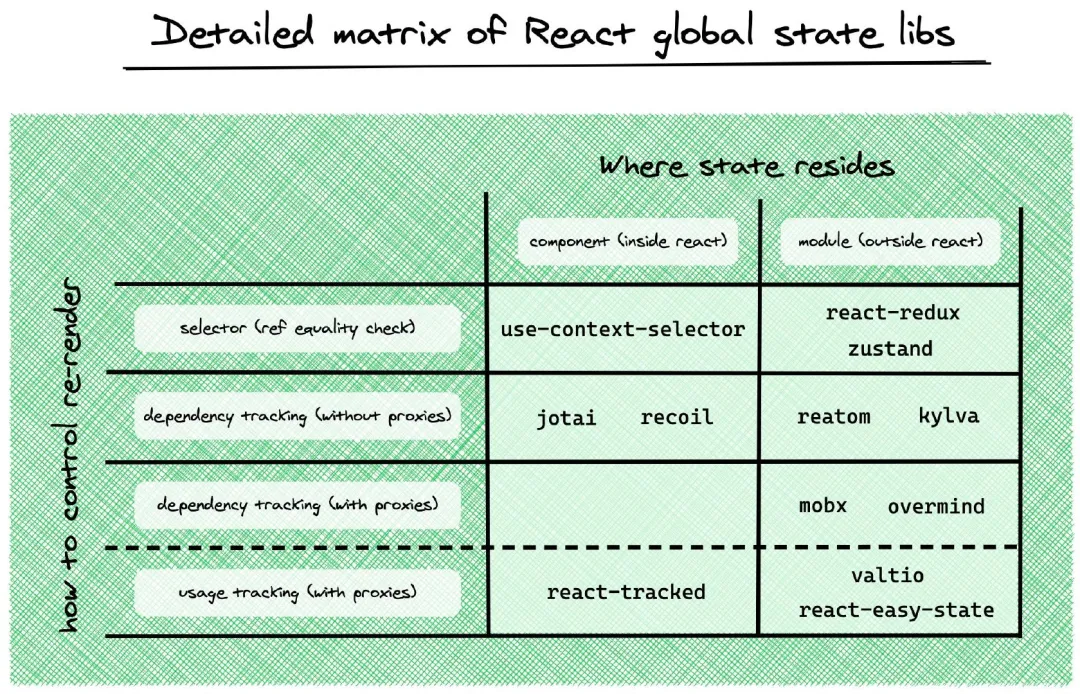 让我们把目光回到 React 上,从目前来看,React 的状态管理有很多,可以见云谦老师的这个文章,不同的框架对比如下: