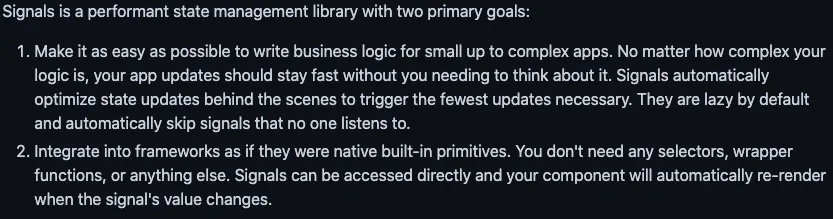 那么是不是 Signals 既可以服务于 Preact,也能集合到其他框架中呢?从 Signals 目标中,我们看到了这点: