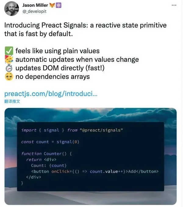 Preact 引入了 Signals,提供了快速的响应式状态原语(或者叫原子吧),那么 Signals 有以下几点:
