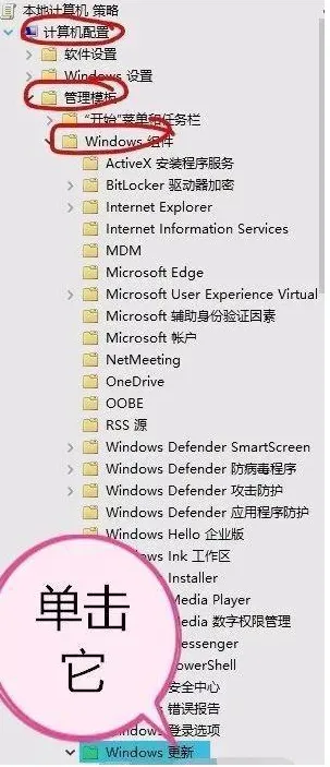 依此点击【计算机配置】、【管理模板】、【windows组件】,找到【windows 更新】