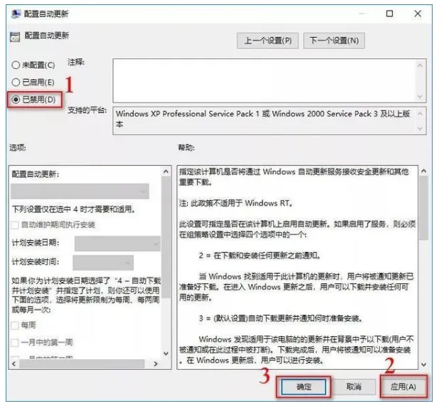 依此选择【已禁用】,点击【应用】,最后点击【确定】即完成设置