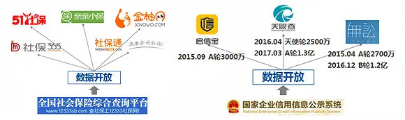 全国社会保险综合查询平台的数据开放,催生了51社保、社保365、社保通等众多“互联网+社保”创业企业的产生。全国企业信用信息公示系统对社会提供开放数据,催生了企信宝、九次方、无讼等高成长的创业企业。