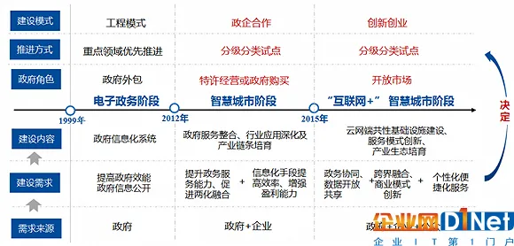 第一阶段:电子政务阶段(1999年-2012年),源于国家信息化发展,以“电子政务”建设为排头兵,旨在提升政府效能。主要通过政府外包和工程建设来实现。