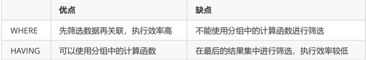 开发中的选择: WHERE 和 HAVING 也不是互相排斥的,我们可以在一个查询里面同时使用 WHERE 和 HAVING。包含 分组统计函数的条件用 HAVING,普通条件用 WHERE。这样,我们就既利用了 WHERE 条件的高效快速,又发挥了 HAVING 可以使用包含分组统计函数的查询条件的优点。当数据量特别大的时候,运行效率会有很大的差别。
