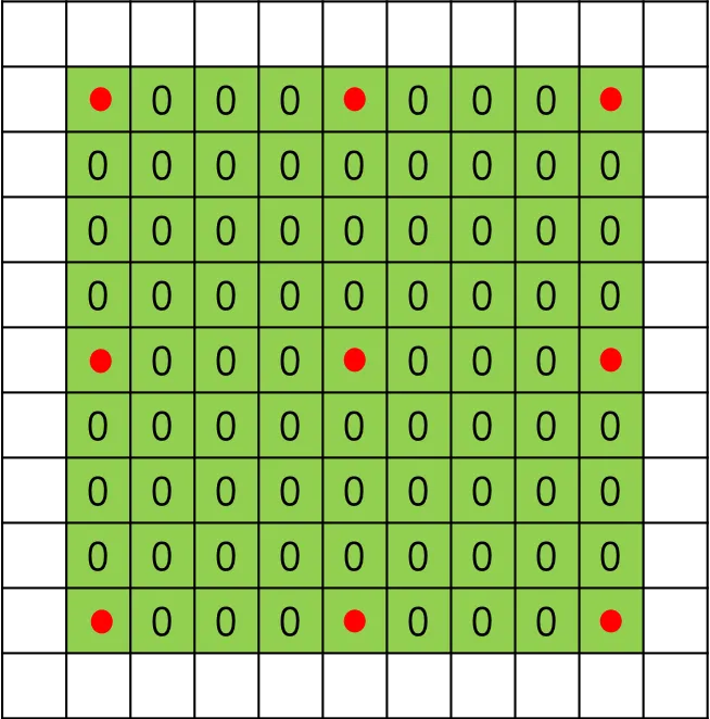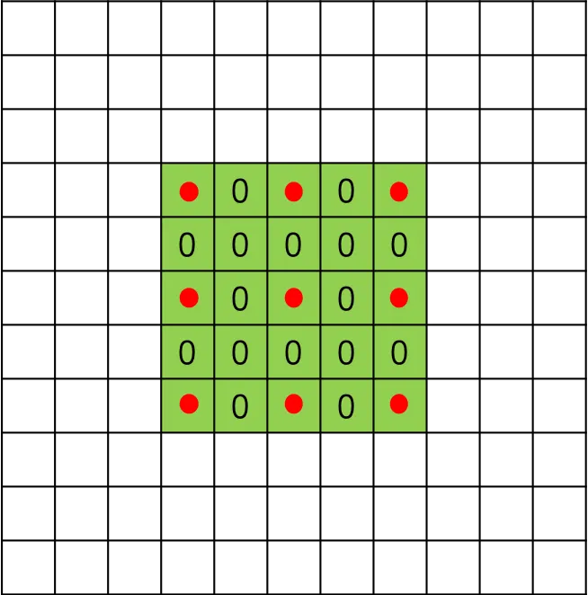 卷积核大小 $k=3$ ,扩张率 $r=2$ 时,计算方式如 图5 所示。