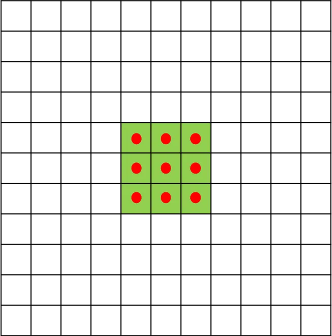 对于一个尺寸为 $3\times{3}$ 的标准卷积,卷积核大小为 $3\times{3}$ ,卷积核上共包含9个参数,在卷积计算时,卷积核中的元素会与输入矩阵上对应位置的元素进行逐像素的乘积并求和。而空洞卷积与标准卷积相比,多了扩张率这一个参数,扩张率控制了卷积核中相邻元素间的距离,扩张率的改变可以控制卷积核感受野的大小。尺寸为 $3\times{3}$ ,扩张率分别为 $1,2,4$ 时的空洞卷积分别如 图1,图2,图3所示。