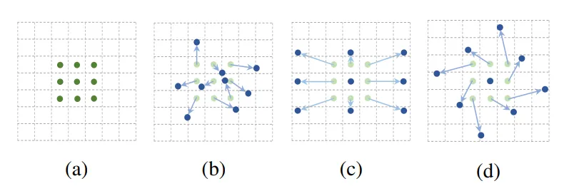 (a) 所示的正常卷积规律的采样 9 个点(绿点);(b)(c)(d) 为可变形卷积,在正常的采样坐标上加上一个位移量(蓝色箭头);其中 (d) 作为 (b) 的特殊情况,展示了可变形卷积可以作为尺度变换,比例变换和旋转变换等特殊情况。