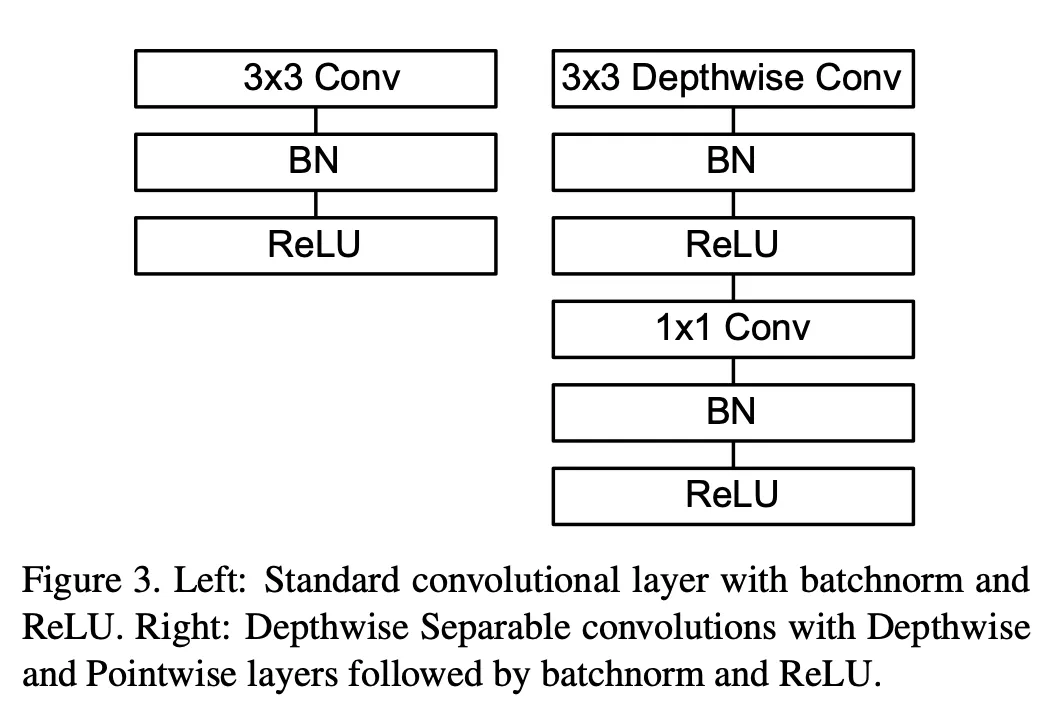 MobileNetv1[1] 中使用的深度可分离卷积如 图 7 右侧所示。相较于左侧的标准卷积,其进行了拆分,同时使用了 BN 层以及 RELU 激活函数穿插在深度卷积运算和逐点卷积运算中。