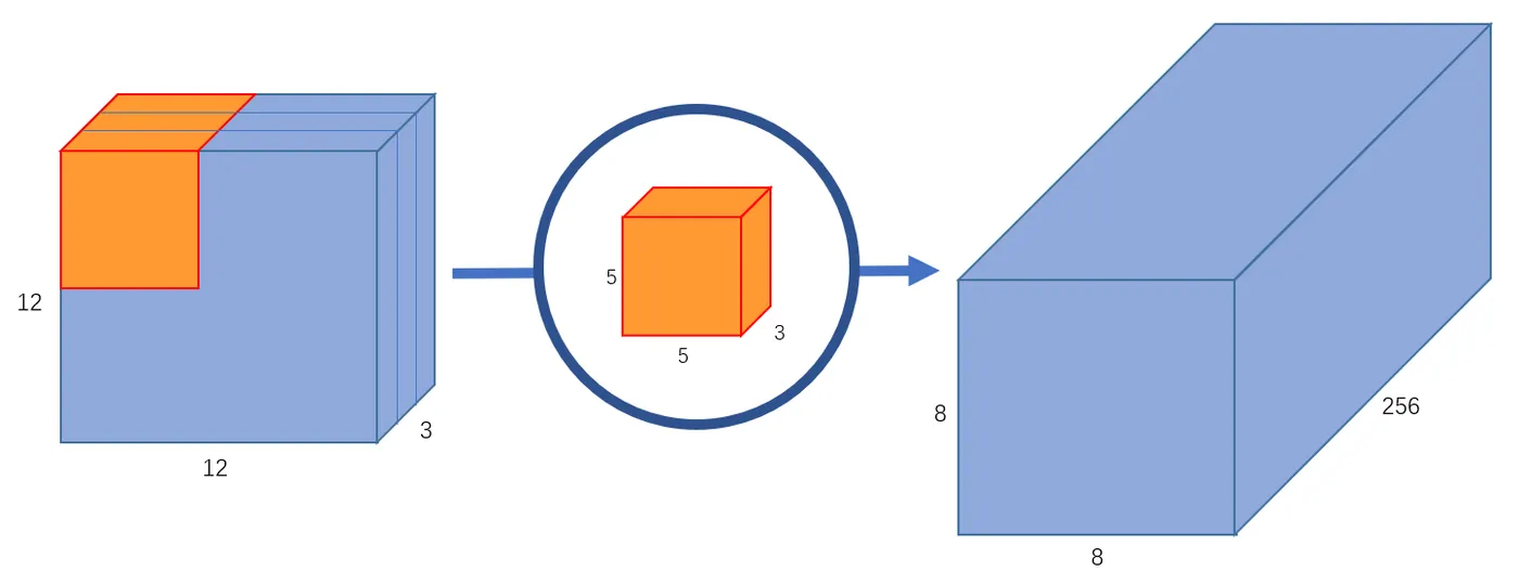 如果我们想增加输出的 channel 数量让网络学习更多种特征呢?这时我们可以创建多个卷积核,比如 256 个卷积核来学习 256 个不同类别的特征。此时,256 个卷积核会分别进行运算,得到 256 个 $8\times 8\times 1$ 的输出特征图,将其堆叠在一起,最终可以得到 $8\times 8\times 256$ 的输出特征图。如 图 3 所示。