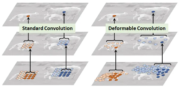 在上面这张图里面,左边传统的卷积显然没有提取到完整绵羊的特征,而右边的可变形卷积则提取到了完整的不规则绵羊的特征。