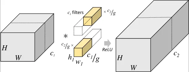 $$h_1 \times w_1 \times \frac{C_1}{g} \times \frac{C_2}{g} \times g = h_1 \times w_1 \times C_1 \times C_2 \times \frac{1}{g}$$