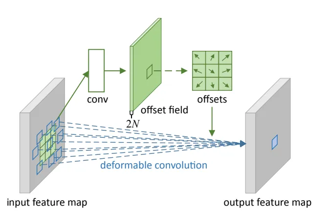 但对于视觉识别的传统CNN模块,不可避免的都存在固定几何结构的缺陷:卷积单元在固定位置对输入特征图进行采样;池化层以固定比率降低空间分辨率;一个ROI(感兴趣区域)池化层将一个ROI分割成固定的空间单元;缺乏处理几何变换的内部机制等。