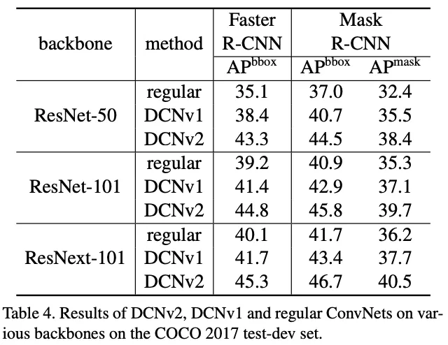 使用可变形卷积,可以更加高效的从图片中获取到目标的特征信息,可以起到提升传统卷积神经网络(如ResNet、Faster R-CNN等)识别和分割上的性能。如以上图5,可以将ResNet等网络中的$3\times3$ 标准卷积操作更改为 $3\times3$ 可变形卷积操作,通过研究发现只要增加很少的计算量,就可以得到较大幅度的性能提升。