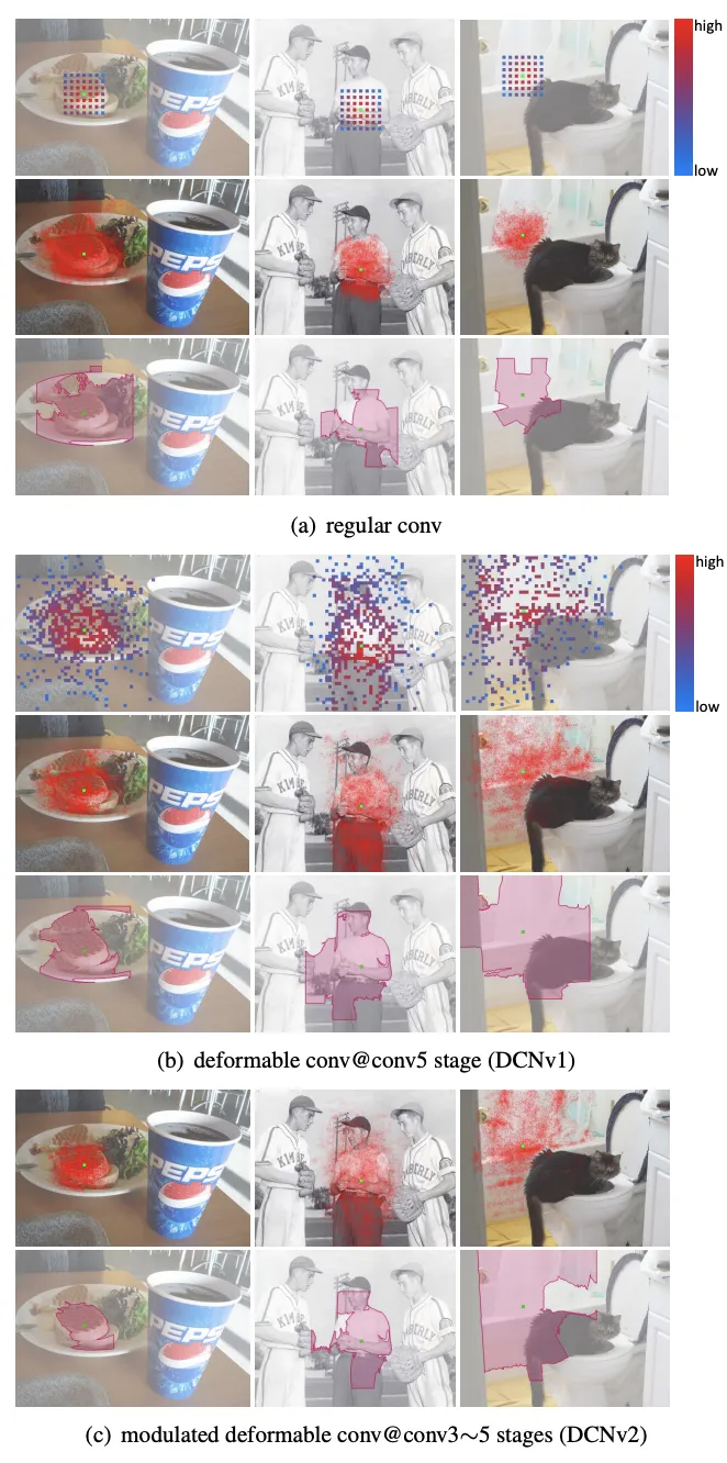 总结来说,DCN v1中引入的offset是要寻找有效信息的区域位置,DCN v2中引入权重系数是要给找到的这个位置赋予权重,这两方面保证了有效信息的准确提取。