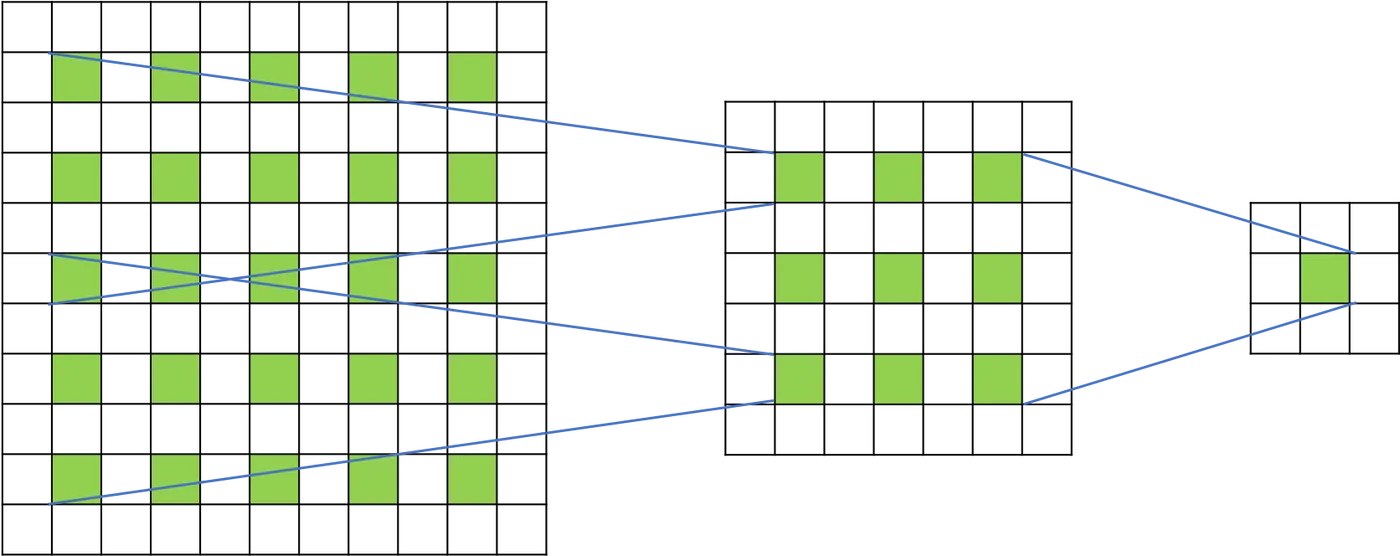 其中,通过一层空洞卷积后,感受野大小为$5\times5$,而通过两层空洞卷积后,感受野的大小将会增加到$9\times9$。