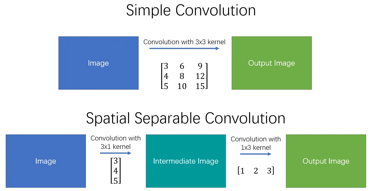 空间分离卷积(spatial separable convolutions),顾名思义就是在空间维度将标准卷积运算进行拆分,将标准卷积核拆分成多个小卷积核。例如我们可以将卷积核拆分成两个(或多个)向量的外积: