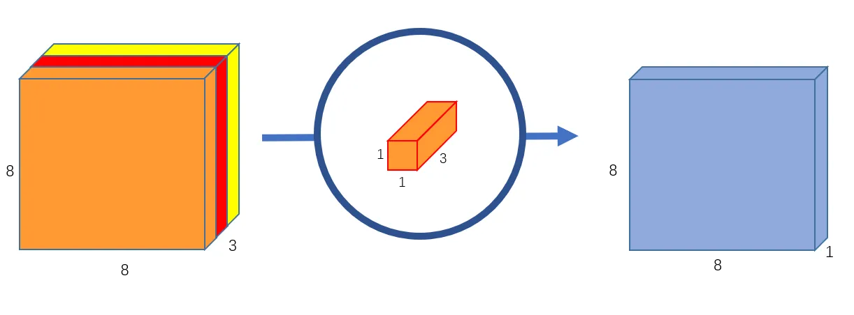 我们使用一个 3 通道的 $1\times 1$ 卷积对上文中得到的 $8\times 8\times 3$ 的特征图进行运算,可以得到一个 $8\times 8\times 1$ 的输出特征图。如 图 5 所示。此时,我们就使用逐点卷积实现了融合 3 个通道间特征的功能。