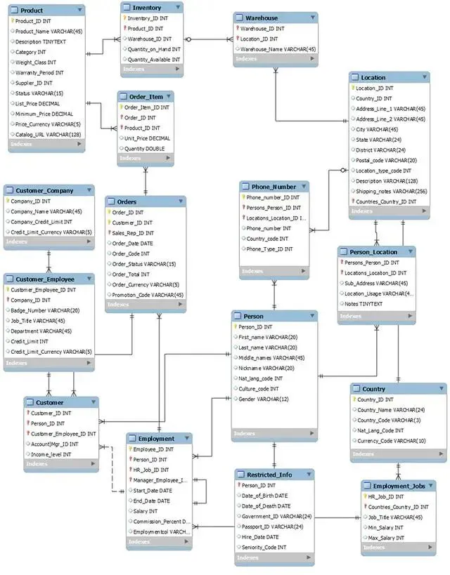 建模的第一步通常是规范化数据,这是一个组织过程,通过减少不一致的依赖性和冗余来提高数据库的灵活性。如果你不熟悉的话,我建议你读一下这个和/或看一些视频!规范化数据库的问题是,任何真正有意思的数据洞察都需要许多连接,随着数据库大小的增加,这些连接会大大降低查询的速度。例如,查看下面的模式,大多数表都不是直接相关的。这意味着要连接订单和位置等两个表中的信息,我们至少需要4个连接(Orders -> Employment -> Person -> Phone_Number -> Location是到达那里的一种方式)