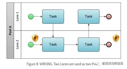 问题。有时,建模者可能会错误地将一个通道视为一个池,从而在单独的通道中表示各个流程。这是错误的,因为通道只是一种“活动分类机制”。下图显示了这个错误。