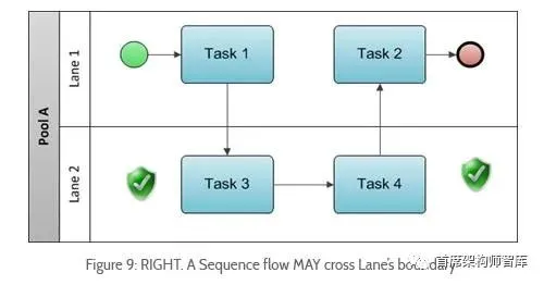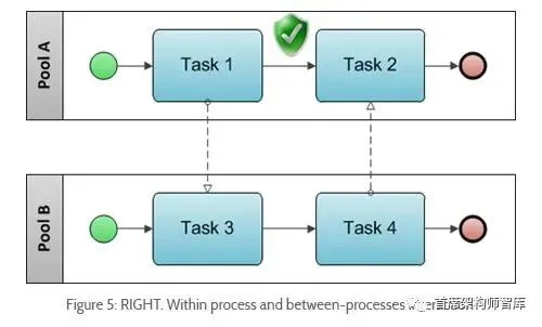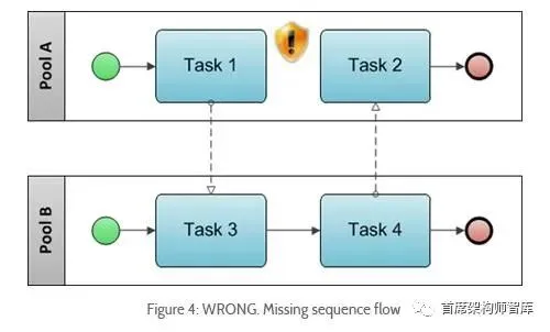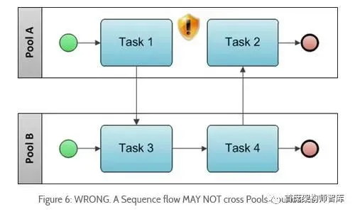 请注意,在这两种情况下,只允许元素之间的连接,如前两幅图所示。基于这些误解,在建模BPMN时,以下三个错误是常见的: